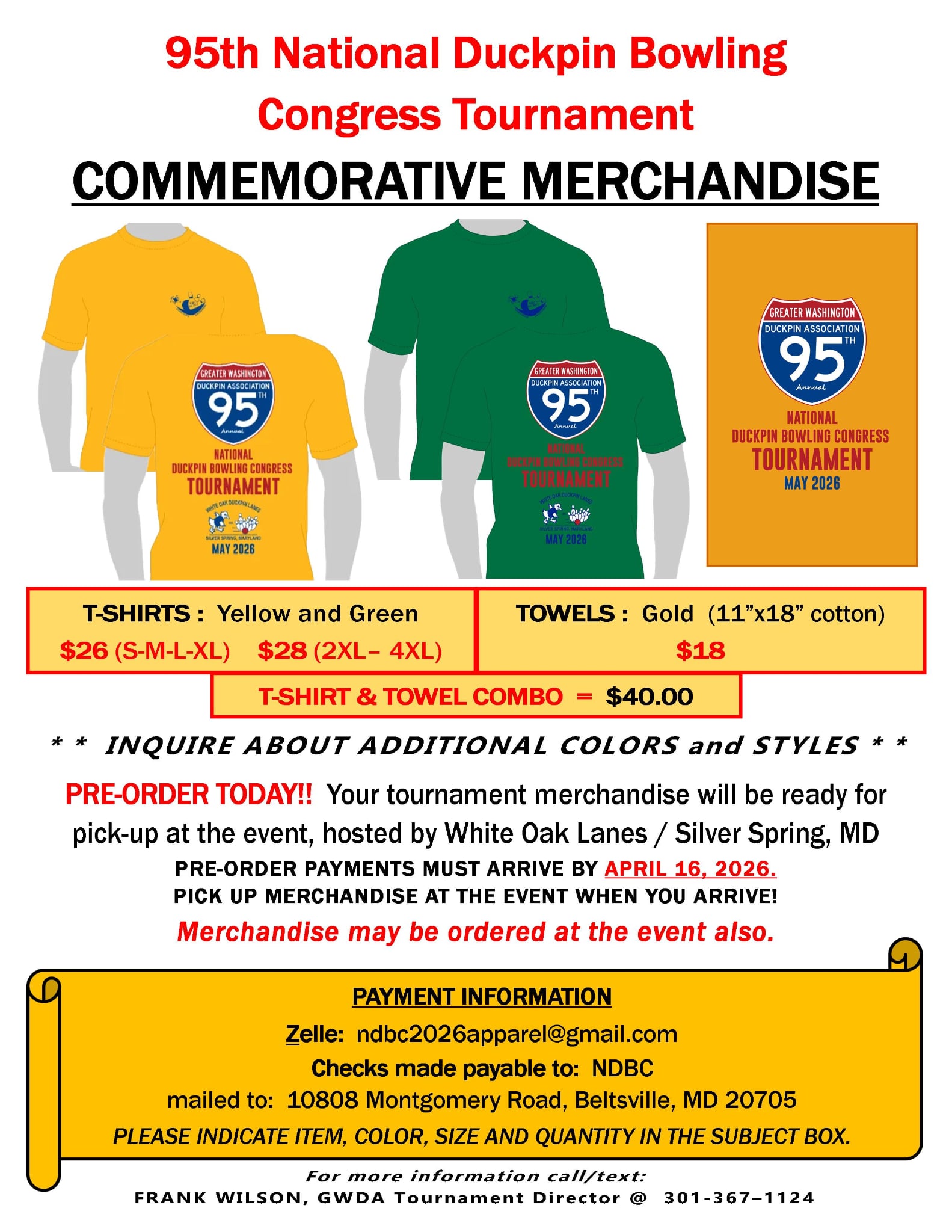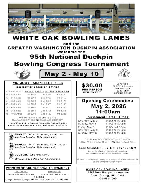 Help make some history - bowl in our 95rd Annual Tournament and this beautiful bowling center! The 2026 National Tournament will be held at White Oak Bowling Lanes, 11207 New Hampshire Avenue, Silver Spring, MD 20904. Both White Oak and the Greater Washington Duckpin Association have gone all out to put together a wonderful Opening Ceremonies which will start at 11:00 a.m. on Saturday, May 2nd. The Tournament will begin immediately afterward and will run for the first two weekends of the month.